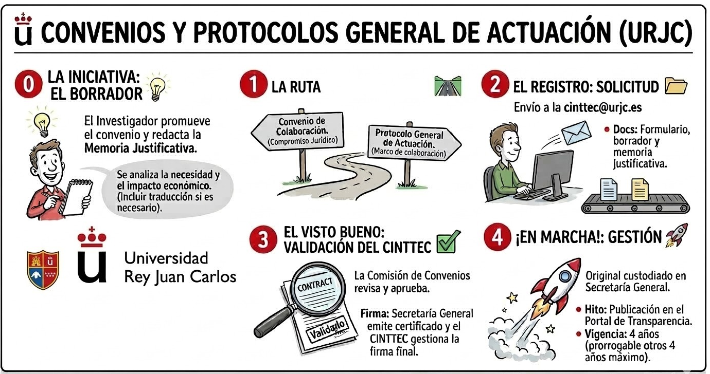 Cuéntanos por qué es importante este acuerdo para la URJC, quiénes participan y si hay financiación. Para ello debes de utilizar la Memoria Justificativa del ConvenioUna vez cumplimentada, debes enviarlo a: cinttec@urjc.es y nosotros le daremos el visto bueno inicial.